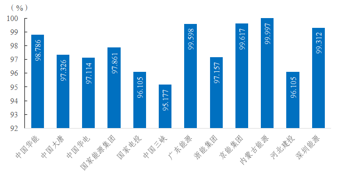 2022年,發電側12家集團公司變壓器可用系數前三位分別是內蒙古能源集團有限公司99.997%、北京能源集團有限責任公司99.617%、廣東省能源集團有限公司99.598%。