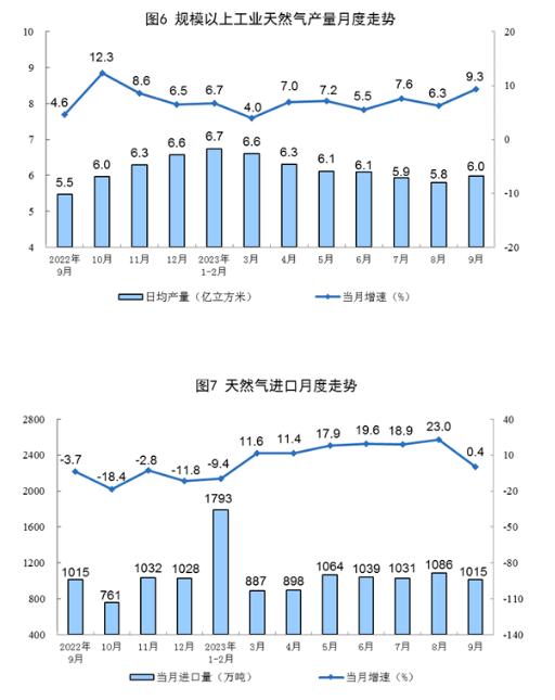 天然氣生產(chǎn)增速加快,進口保持平穩(wěn)。9月份,生產(chǎn)天然氣179億立方米,同比增長9.3%,增速比8月份加快3.0個百分點,日均產(chǎn)量6.0億立方米。進口天然氣1015萬噸,同比增長0.4%,增速比8月份回落22.6個百分點。