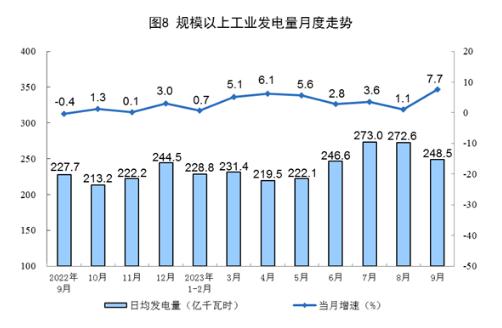 電力生產(chǎn)增速加快。9月份,發(fā)電量7456億千瓦時,同比增長7.7%,增速比8月份加快6.6個百分點,日均發(fā)電248.5億千瓦時。1—9月份,發(fā)電量66219億千瓦時,同比增長4.2%。