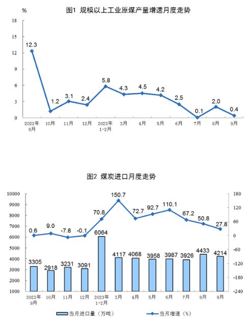 原煤生產(chǎn)保持穩(wěn)定,進口快速增長。9月份,生產(chǎn)原煤3.9億噸,同比增長0.4%,增速比8月份放緩1.6個百分點,日均產(chǎn)量1310萬噸。進口煤炭4214萬噸,同比增長27.8%,增速比8月份回落23.0個百分點。