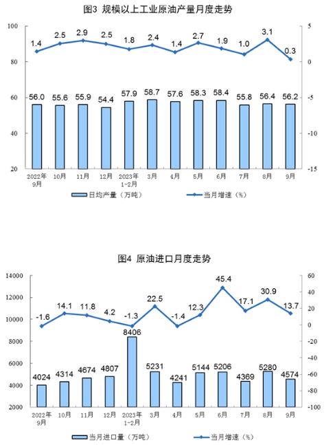 原油生產(chǎn)平穩(wěn)增長,進口較快增長。9月份,生產(chǎn)原油1687萬噸,同比增長0.3%,增速比8月份放緩2.8個百分點,日均產(chǎn)量56.2萬噸。進口原油4574萬噸,同比增長13.7%,增速比8月份回落17.2個百分點。
