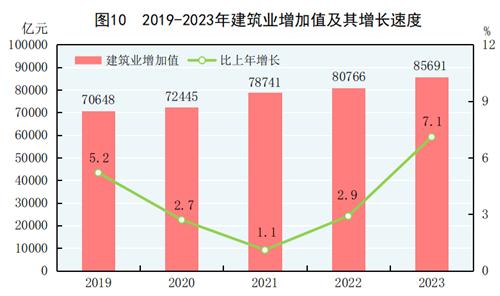 全年建筑業增加值85691億元,比上年增長7.1%。全國具有資質等級的總承包和專業承包建筑業企業利潤8326億元,比上年增長0.2%,其中國有控股企業4019億元,增長4.3%。