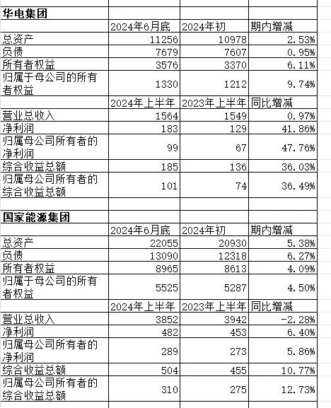 請注意,上述數據反映了六大發電集團在2024年上半年與2023年同期相比的變化情況。這些數字有助于了解企業在經濟活動中的表現趨勢。