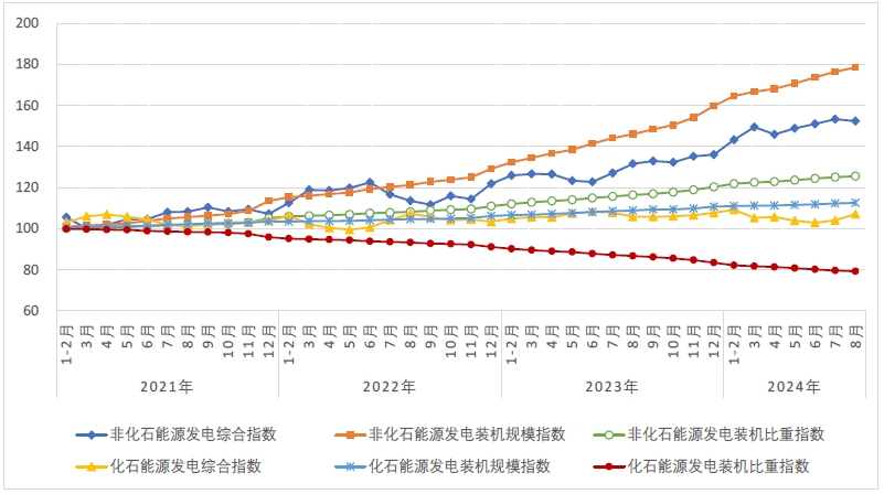 8月,非化石能源發(fā)電裝機(jī)規(guī)模指數(shù)為178.5,“十四五”以來(lái)非化石能源發(fā)電裝機(jī)規(guī)模累計(jì)增長(zhǎng)了78.5%,同比增長(zhǎng)22.2%。非化石能源發(fā)電裝機(jī)比重指數(shù)為125.6,“十四五”以來(lái)非化石能源發(fā)電裝機(jī)比重累計(jì)提升了25.6%(比重從2020年底的44.8%提高至2024年8月底的56.2%)。