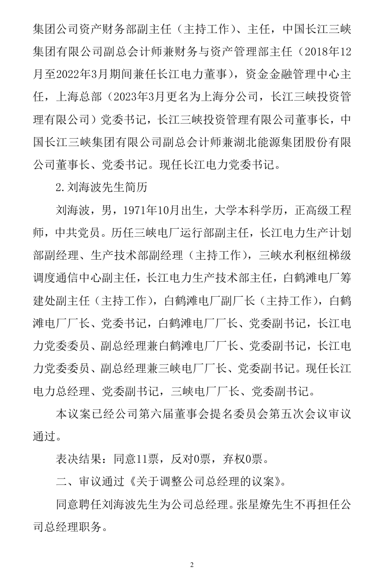 根據《公司法》《公司章程》等有關規定,經公司控股股東中國長江三峽集團有限公司推薦、董事會提名委員會審核,董事會同意提名劉姿女士為公司董事候選人,任期自股東大會審議通過之日起至第二屆董事會任期屆滿之日止;該事項尚需提交公司股東大會審議。經公司董事長提名、董事會提名委員會審核,董事會同意聘任劉姿女士為公司總經理,任期自本次董事會審議通過之日起至第二屆董事會任期屆滿之日止。