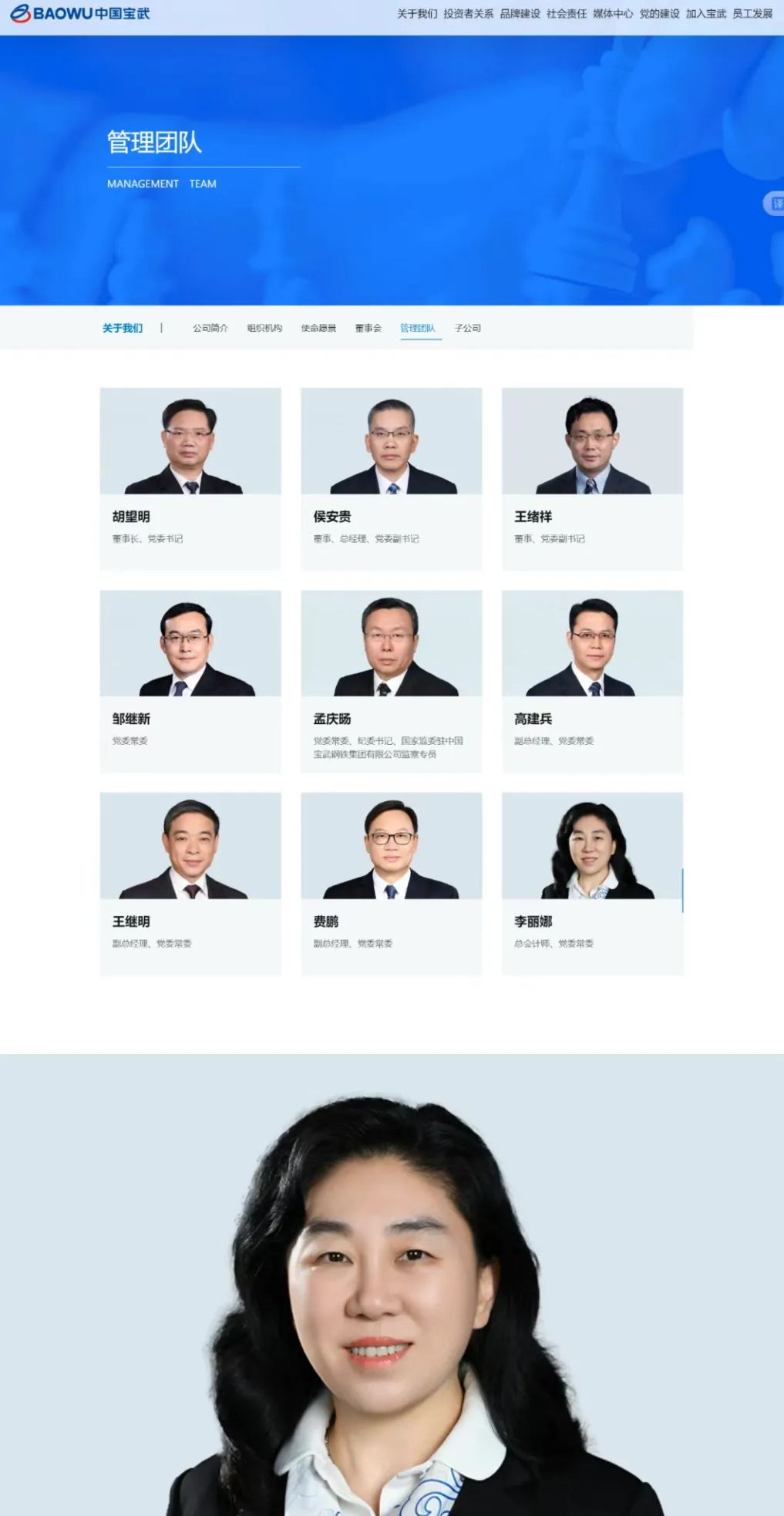 據(jù)中國寶武鋼鐵集團有限公司(以下簡稱“寶武鋼鐵集團”)官網(wǎng)“管理團隊”欄目最新信息顯示,李麗娜已任集團總會計師、黨委常委。她此前擔任中國能源建設股份有限公司黨委常委、總會計師。