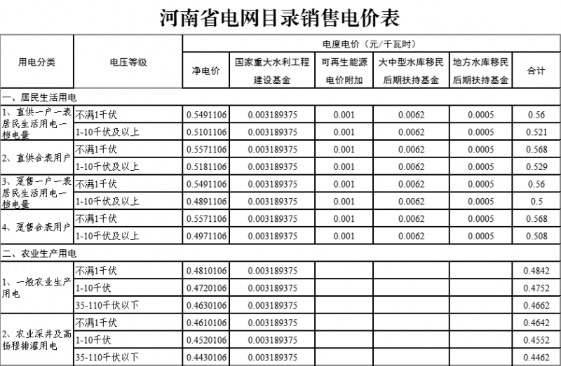 二、自2021年10月15日起,全面取消工商業(yè)目錄銷售電價(jià),僅保留居民生活、農(nóng)業(yè)生產(chǎn)目錄銷售電價(jià),調(diào)整后的河南省電網(wǎng)目錄銷售電價(jià)見附件1。執(zhí)行兩部制電價(jià)的工商業(yè)用戶,基本電價(jià)仍按國家現(xiàn)行有關(guān)規(guī)定執(zhí)行。