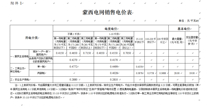 備注:1、農(nóng)村低壓各類用電按上表合計(jì)欄電價(jià)執(zhí)行,其中含維管費(fèi)。 2、一戶一表居民生活用電二檔、三檔電價(jià),在一檔電價(jià)基礎(chǔ)上每千瓦時(shí)分別提高0.05元和0.3元。