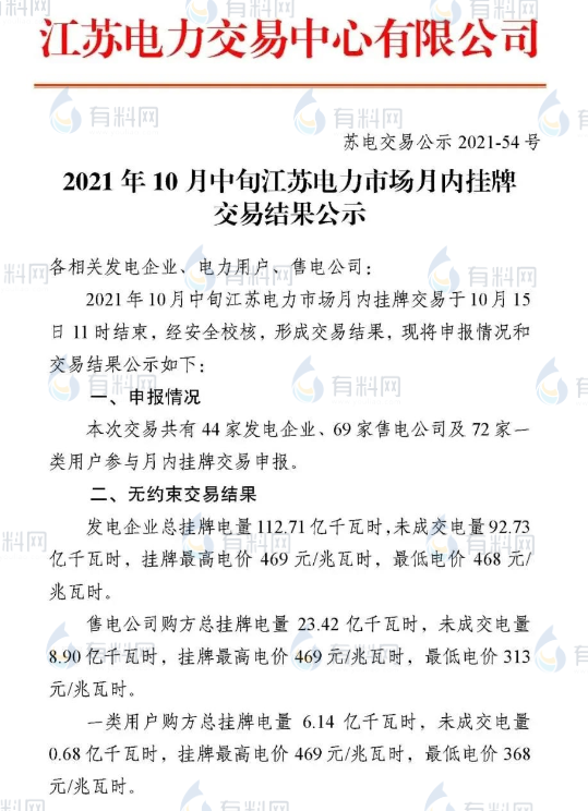 江蘇組織開展了10月中旬月內(nèi)掛牌交易,共成交電量19.98億千瓦時(shí),成交均價(jià)468.97元/兆瓦時(shí),成交價(jià)較基準(zhǔn)價(jià)上浮了19.94%。