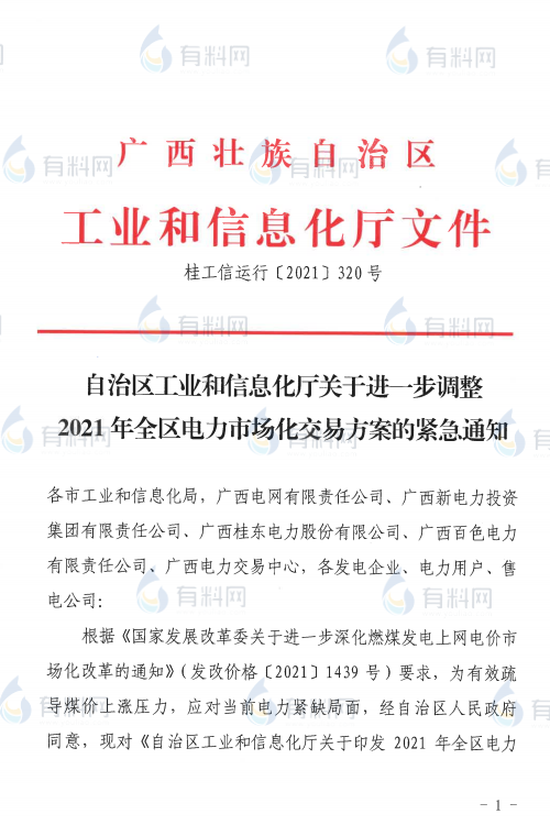 廣西發(fā)布《自治區(qū)工業(yè)和信息化廳關(guān)于進(jìn)一步調(diào)整2021年全區(qū)電力市場化交易方案的緊急通知》,在緊急通知中,高耗能企業(yè)電價(jià)直接上浮50%進(jìn)行結(jié)算。