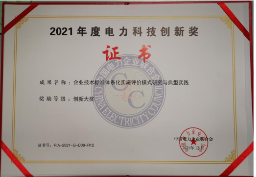 北京中電普華信息技術有限公司參與申報的《企業技術標準體系化實施評價模式研究與典型實踐》項目榮獲2021年度電力科技創新獎大獎。