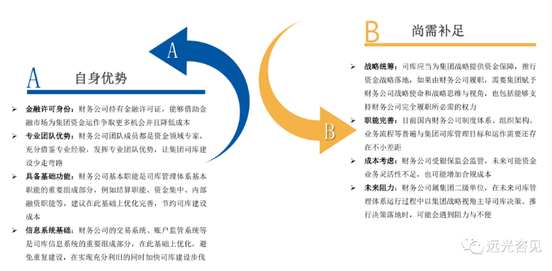 有不少企業(yè)會有困惑,是否可以以財(cái)務(wù)公司為基礎(chǔ)構(gòu)建司庫管理體系?這個不建議直接用“是\否”來回答,或許回答“部分可以”會比較適宜。從財(cái)務(wù)公司優(yōu)勢和可能存在的不足兩個角度進(jìn)行簡要分析,如圖: