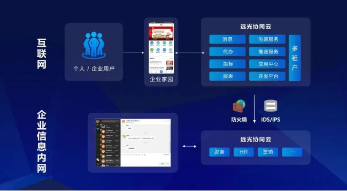 混合部署模式兼顧便利與安全 遠光“企業家園”采用公有云與私有云共存的混合云架構,即對于企業商密等級較低的數據,如消息提醒、待辦提醒等可以通過移動端在外網進行實時訪問,對于企業內部數據、商密等級高的數據,依然保留在本地,通過企業電腦端才能訪問。充分利用互聯網應用的靈活性、便利性的同時,保證數據的安全性、私密性。
