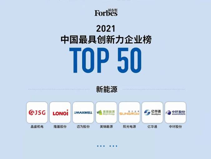 福布斯中國日前發布2021年中國最具創新力企業榜單,共計提名了50家最具創新力并持續成長的中國企業。陽光電源憑借在新能源領域多年的持續穩健運營、領先的科創實力登陸榜單。