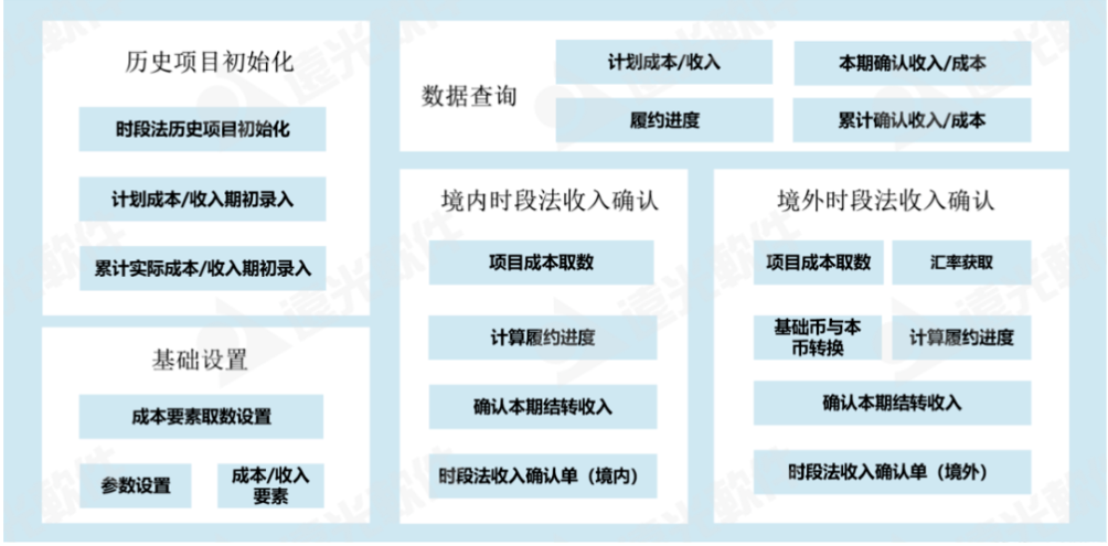 時段法收入核算系統包括“歷史項目初始化”、“基礎設置”、“境內時段法收入確認”、“境外時段法收入確認”和“數據查詢”五個模塊,詳細見以下圖所示。
