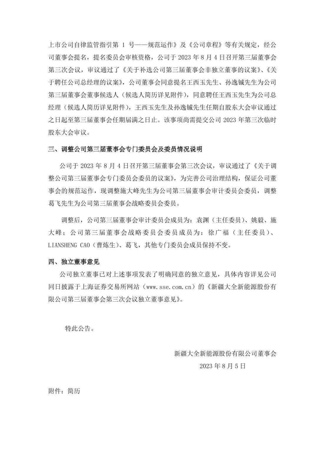 此外,公司董事會同意提名王西玉、孫逸鋮為公司第三屆董事會董事候選人,同意聘任王西玉為公司總經理,王西玉及孫逸鋮任期自股東大會審議通過之日起至第三屆董事會任期屆滿之日止。該事項尚需提交公司2023年第三次臨時股東大會審議。