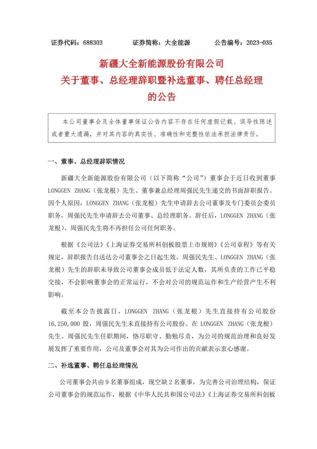 新疆大全新能源股份有限公司(以下簡稱“大全能源”)董事張龍根、董事兼總經理周強民辭職。
