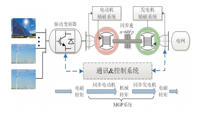 黃永章:目前新能源并網(wǎng)方法最大的技術(shù)問(wèn)題就是它們是電流源,而非電壓源。新能源同步機(jī)這個(gè)方案的出發(fā)點(diǎn)是,同步發(fā)電機(jī)是傳統(tǒng)交流電力系統(tǒng)的基礎(chǔ),而且已經(jīng)被證明了非常有效。于是我們就提出,既然同步機(jī)這么好,為什么不把同步機(jī)保留下來(lái),而一定要替換掉呢?如果可以保留,應(yīng)該怎么保留?答案就是用新能源驅(qū)動(dòng)一個(gè)同步電動(dòng)機(jī),再用同步電動(dòng)機(jī)帶動(dòng)同步發(fā)電機(jī)發(fā)電并網(wǎng),這樣就把新能源電力轉(zhuǎn)變成了一個(gè)交流電網(wǎng)需要的電壓源。我們把這個(gè)裝置稱(chēng)為同步電機(jī)對(duì)并網(wǎng)(MGP),隨著研究的逐步深入,我們又把這個(gè)方案叫作新能源同步機(jī)