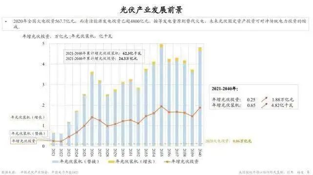 按照剛才的演進(jìn)路徑,光伏產(chǎn)業(yè)投資假如從2021年開(kāi)始,新增的電源都是由光伏裝機(jī)來(lái)實(shí)現(xiàn),那么下面這張圖就展示了未來(lái)的20年的一個(gè)投資逐漸增加的過(guò)程,從開(kāi)始大概0.25萬(wàn)億,到后來(lái)大概2萬(wàn)億的年投資,整個(gè)全過(guò)程完成約20年,總共的投資規(guī)模大概是20多萬(wàn)億元。