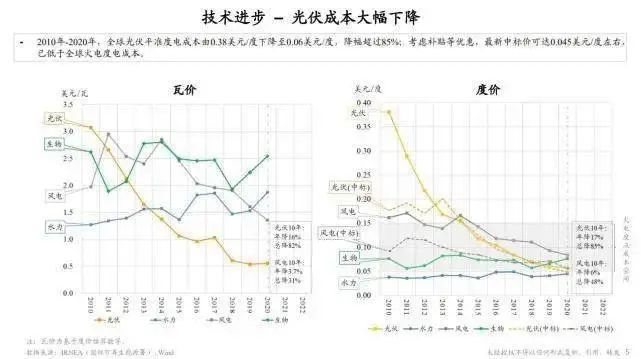 再看新優(yōu)勢(shì),就是技術(shù)進(jìn)步使得光伏成本大幅下降。在過(guò)去的十年,光伏的度電價(jià)格降幅超過(guò)85%。左圖中每瓦的光伏裝機(jī)的價(jià)格有一個(gè)很大的降幅,然后看右圖中光伏每度電的價(jià)格也有了大幅度下降,這也是在幾種不同的可再生能源類別中成本降幅最快的,這樣的話就大大提升了光伏的經(jīng)濟(jì)可行性。