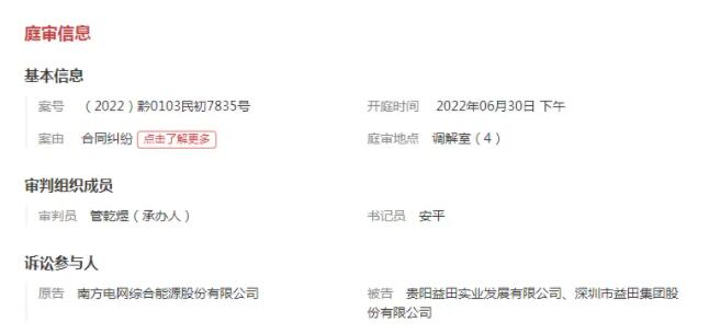 6月28日,深圳市益田集團股份有限公司新增開庭公告,開庭時間為2022年06月30日 15:00,案號為(2022)黔0103民初7835號,案由系合同糾紛,上訴人/原告為南方電網綜合能源股份有限公司,被上訴人/被告為貴陽益田實業發展有限公司,深圳市益田集團股份有限公司,法院為貴州省貴陽市云巖區人民法院。