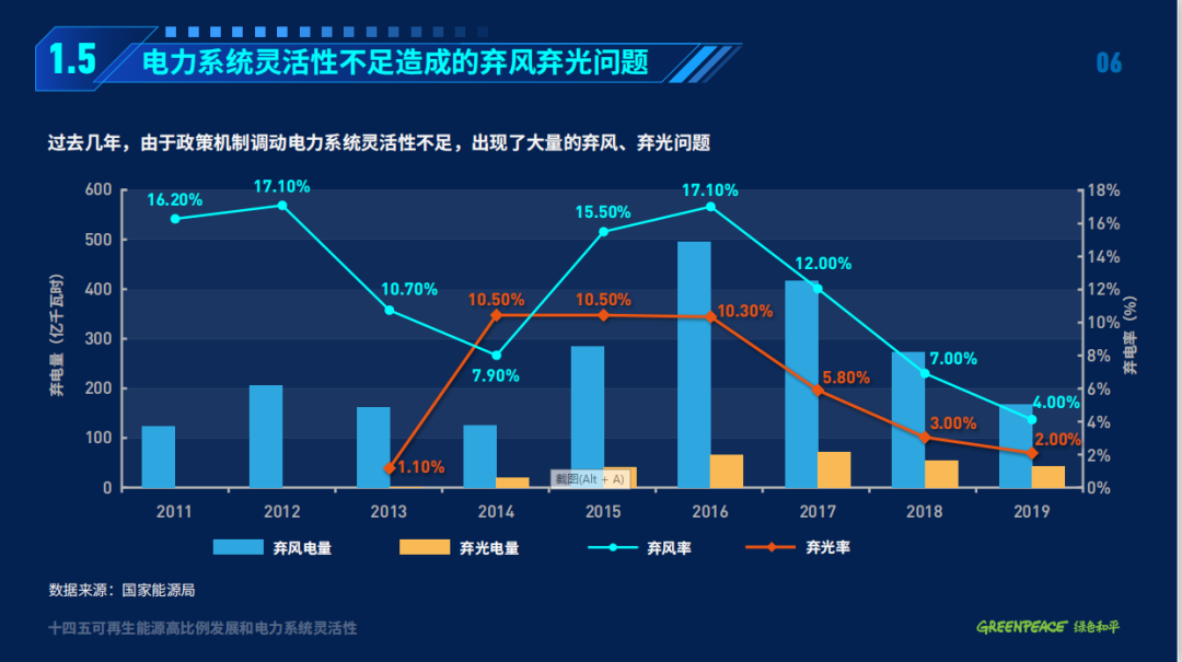 目前,中國以煤電為主的電力系統靈活性嚴重不足,電力系統的僵化導致了棄風、棄光問題的出現。2011-2019年,中國的棄風和棄光率一度高達17.1%和10.5%,造成了大量發電資源的浪費。2016-2018年間,中國棄風和棄光電量共計1389億千瓦時 ,相當于約3000萬千瓦煤電廠的發電量。