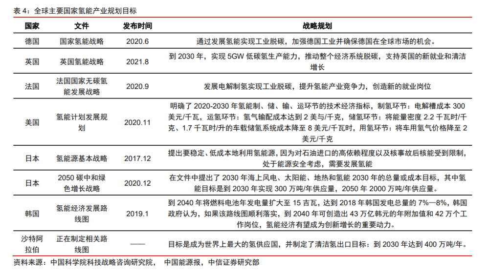 全球氫能發展相對領先的地區有美國、歐洲、日韓,而沙特阿拉伯、阿聯酋等中東國家也瞄準了氫能,沙特阿拉伯雖未發表書面文件,但是已經提出了氫能戰略目標。