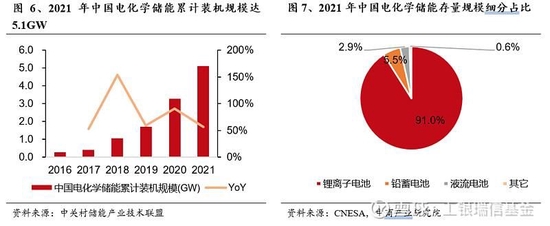 我國電化學儲能裝機規模持續高速增長,其中鋰電池儲能規模占比超九成。2021年,中國電化學儲能累計裝機規模5.1GW,同比增長56.5%,2016-2021年CAGR高達79.3%。其中,鋰離子電池儲能技術裝機規模4.7GW,裝機規模占比91.0%;鉛蓄電池儲能裝機規模0.3GW,占比5.5%;液流電池儲能技術裝機規模0.1GW,占比2.9%。