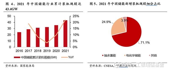 我國儲能市場穩步擴容,電化學儲能份額增長明顯。在新能源發電規模大幅增長的推動下,我國儲能裝機規模一直保持高速增長的趨勢。根據國家能源局數據,2021年中國儲能市場累計裝機功率位居全球第一,為43.4GW,同比增長21.9%,2016-2021年儲能累計裝機量年均復合增長率為12.3%。2021年我國抽水蓄能新增裝機5.2GW,占比71.1%;電化學儲能新增裝機1.8GW,占比24.9%,較2020年占比9.2%增幅較大,電化學儲能市場份額增長明顯。