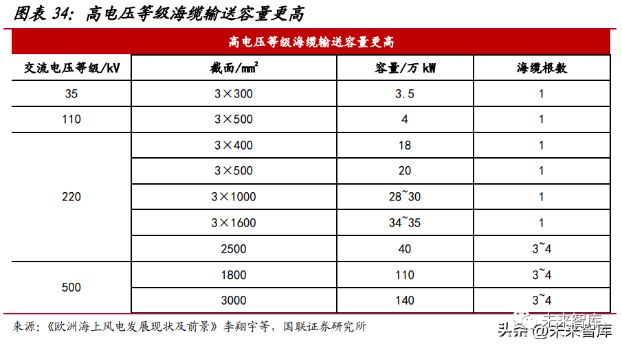 海纜對耐腐蝕、抗拉耐壓、阻水防水等性能要求更高。與陸纜相比,海纜鋪設于 海底,水下情況復雜,需要承受較大水壓,因此必須具有良好的阻水和機械性能,防 止水分滲透導致海纜發生故障,也需要具備良好的機械性能為、防止船只錨害和洋流 沖刷,此外海纜還需具有防腐蝕、防海洋生物的能力,保障壽命。海纜趨勢一:離岸距離、大兆瓦風機驅動使用高電壓等級海纜。過去國內已并網 的海上風電項目離岸距離較近(30km 以內),均采用交流海纜送出方式,但隨著風機 大型化、項目向深遠海延伸過去,35kV、110kV 交流海纜受輸送容量限制,同時鋪設 海纜根數多對海底走廊有很高占用,輸電損耗也較大。同輸電功率的情況下,電壓越高電流就越小,高壓輸電能減少輸電時的電流從而降低因電流產生的熱損耗和降低遠 距離輸電的材料成本。國內目前主流交流海纜電壓等級為 220kV,采用單回三芯結構, 輸電能力在 18~35 萬 kW,高電壓等級(更高 220kV、500kV)輸電能力顯著提高。