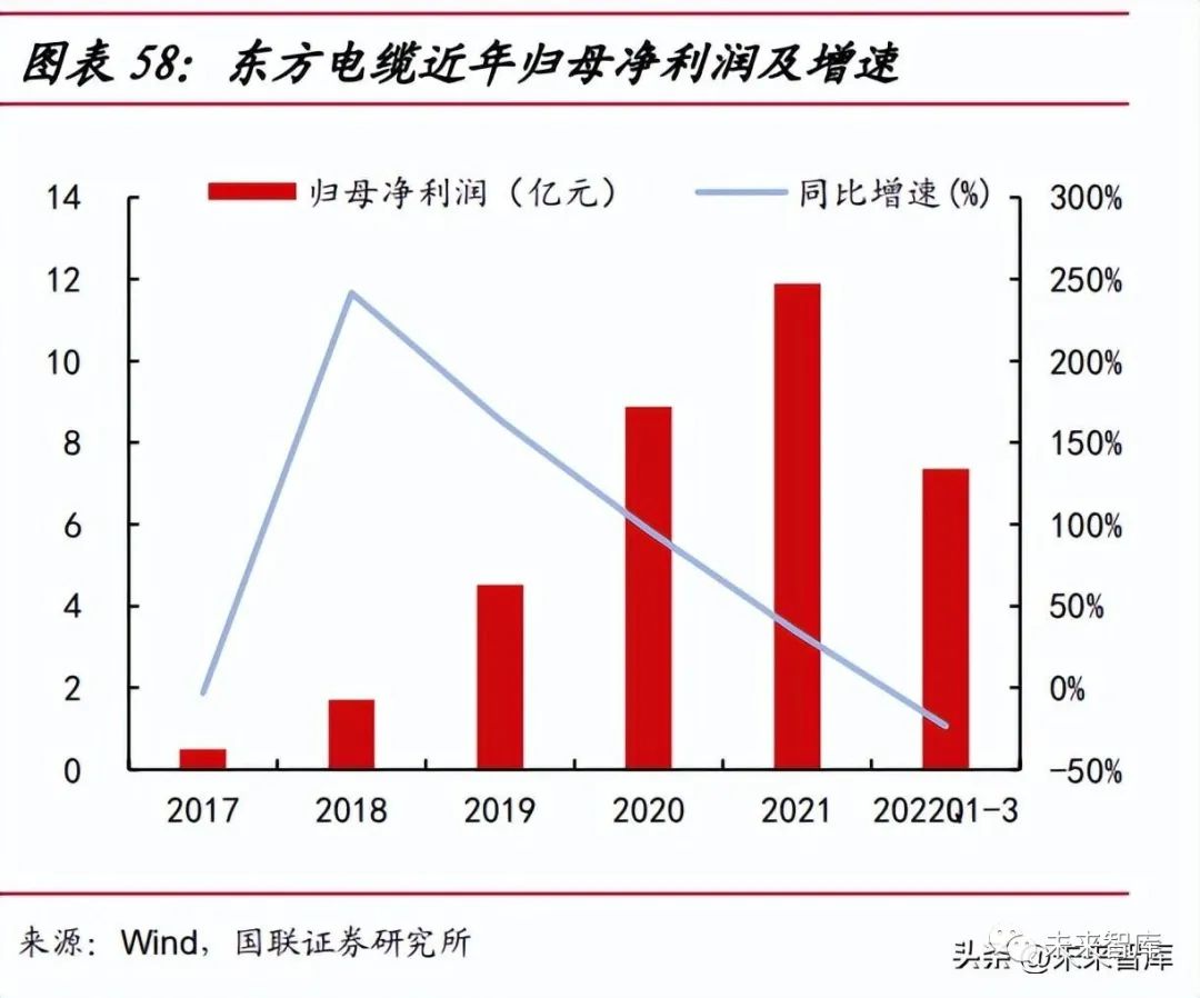 全國海纜龍頭,營收利潤同步增長。公司作為國內電線電纜龍頭企業,業務全面 覆蓋陸纜系統、海纜系統、海洋工程三大產品領域,并在高端線纜專業領域實現多項 技術突破。2022 年前三季度,公司營業收入同比下滑 1.88%,歸母凈利潤同比下滑 23.43%, 主要由于國內海風搶裝潮的結束及疫情影響需求,部分海纜項目交付延后,導致主營 業務中海纜系統收入有所下滑。