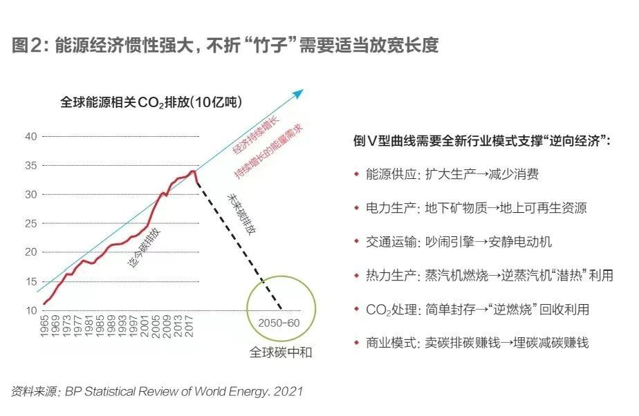 這個倒V型曲線需要全新的商業模式來支持逆向經濟,即所有的能源供應、電力生產等都要反過來,要從賣碳排碳賺錢的商業模式變成埋碳減碳賺錢的商業模式。