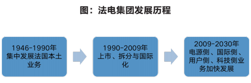 20世紀40年代,為了戰后重建,法國政府對電力行業實施國有化,組建了法電。1946年,法國將1450家私營的發、輸、配電公司及燃氣公司國有化,組建成法國電力公司。在法國電力工業發展初期,法電受政府要求集中力量開展水電、火電、核電、輸電建設,迅速完成了資產、人才、技術、資源的原始積累。