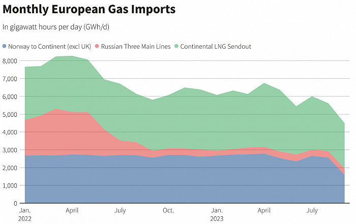 安迅思 (ICIS) 天然氣分析主管湯姆·馬澤克-曼瑟 (Tom Marzec-Manser)認為:“歐洲已成功實現(xiàn)了對俄羅斯天然氣的替代,但實際上,這背后是以犧牲更廣泛的經(jīng)濟活動作為代價的。”