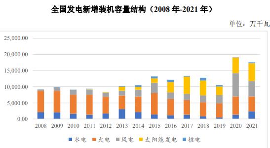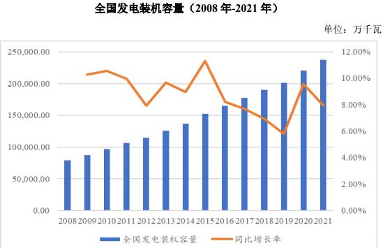 近年來,我國發電裝機容量持續增長,風電、核電以及太陽能發電等裝機規模增速較快。根據中電聯的統計,截至 2021 年底,全國發電裝機容量 237,692萬千瓦,同比增長 7.9%。其中,火電 129,678 萬千瓦,同比增長 4.1%;水電 39,092萬千瓦,同比增長 5.6%;風電 32,848 萬千瓦,同比增長 16.6%;核電 5,326 萬千瓦,同比增長 6.8%;太陽能發電 30,656 萬千瓦,同比增長 20.9%。