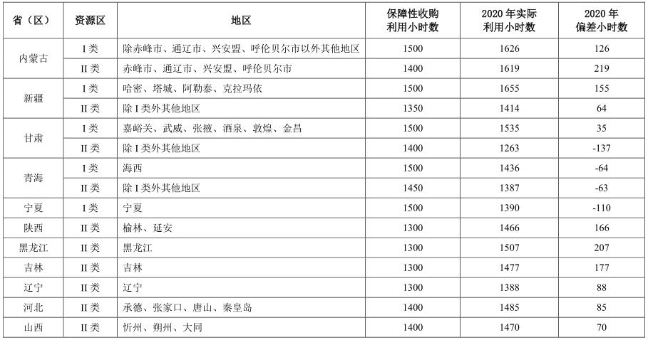2020年,在規(guī)定風(fēng)電最低保障收購年利用小時數(shù)的地區(qū)中,甘肅III類資源區(qū)、寧夏III類資源區(qū)和山西IV類資源區(qū)未達(dá)國家最低保障收購年利用小時數(shù)要求,實際利用小時數(shù)比最低保障收購年利用小時數(shù)分別低162小時、197小時和150小時。2020年,在規(guī)定光伏發(fā)電最低保障收購年利用小時數(shù)的地區(qū)中,甘肅II類地區(qū)、青海I類和II類地區(qū)以及寧夏I類地區(qū)等4個地區(qū)未達(dá)到光伏發(fā)電最低保障收購年利用小時數(shù)要求,其中,甘肅II類地區(qū)比最低保障收購年利用小時數(shù)地區(qū)低137小時;青海I類和II類地區(qū)比最低保障收購年利用小時數(shù)分別低64小時和63小時;寧夏I類地區(qū)比最低保障收購年利用小時數(shù)低110小時。