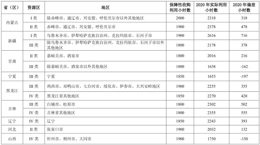 表3 2020年風(fēng)電重點地區(qū)最低保障收購年利用小時數(shù)落實情況