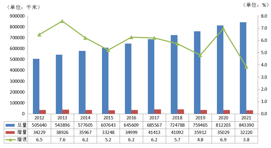 2021年,全國電網220千伏及以上變電設備容量共49.4億千伏安,同比增長5.0%;220千伏及以上輸電線路回路長度共84萬千米,同比增長3.8%。