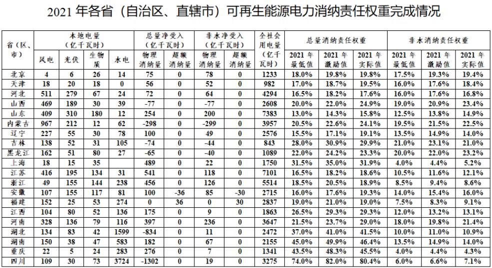 國家能源局關于2021年可再生能源電力消納責任權重完成情況的通報