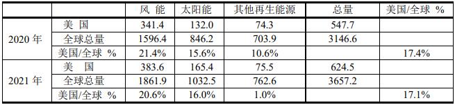 ⒅ 在再生能源中風電場和光伏發展得最快,其價格已被用戶接受。根據BP 2022年報告,得出下表。中國風能和光伏發電發電進展迅速,2021年中國占全球總量的27.4%,而同期美國為17.1%.