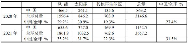 中國風能和光伏發電(單位:TWh)