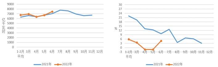 圖1 2021、2022年分月全社會用電量及其增速