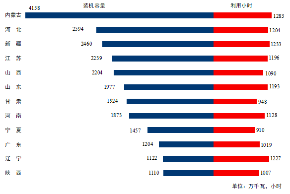 圖3 1-6月份風電裝機較多省份風電裝機容量和設備利用小時