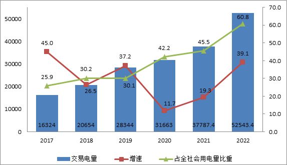 按交易結算口徑統計,2022年全國市場交易電量共5.25萬億千瓦時,同比增長39%,占全社會用電量比重達60.8%,同比提高15.4個百分點。其中,跨省跨區市場化交易電量首次超1萬億千瓦時,同比增長近50%。2022年國家電網經營區域市場交易電量達4.16萬億千瓦時,同比增長42.7%;南方電網經營區域市場交易電量0.85萬億千瓦時,同比增長27.4%;內蒙古電網經營區域市場交易電量0.24萬億千瓦時,同比增長24.9%。在電力交易機構注冊的市場主體數量首次超過60萬家,同比增長29%。