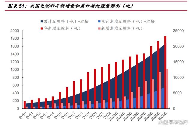 我們根據目前已公布的在運、在建以及核準待建核電機組規模進行估算,2025 當年將產生 1330 噸乏燃料,累計乏燃料貯存量達 13099 噸;2030 年當年將產生 1883 噸乏燃料,累計 21254 噸,考慮堆內貯存池 10 年臨時貯存規模,2025 年、 2030 年新產生的離堆乏燃料分別為 426 噸、1024 噸;累計需要被處理的離堆乏燃 料分別達到 3121 噸、7095 噸。綜上,2030 年前國內需建成具備年處理能力達到千 噸以上規模的乏燃料后處理廠,目前僅 60 噸/年。