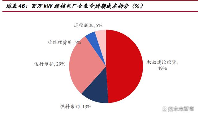 核電在各基荷能源類型中燃料成本占比顯著偏低。核電站具有初始投資高、燃料 費用較低的特點。初始建設投資一般占電站全生命周期的比例為 45-50%,運營成本 40-45%,其中燃料采購成本(包括鈾礦開采、鈾轉化濃縮、燃料組件制造等前段環 節)僅占 10-15%。經合組織核電站的總燃料成本通常僅為燃煤電廠的 1/3~1/2、為 天然氣聯合循環電廠 1/4~1/5。此外值得注意的是,核燃料的后處理成本占核電站全 生命周期成本約 5%,隨著我國核電存量裝機規模的擴大,乏燃料后處理市場潛力不 容小覷。