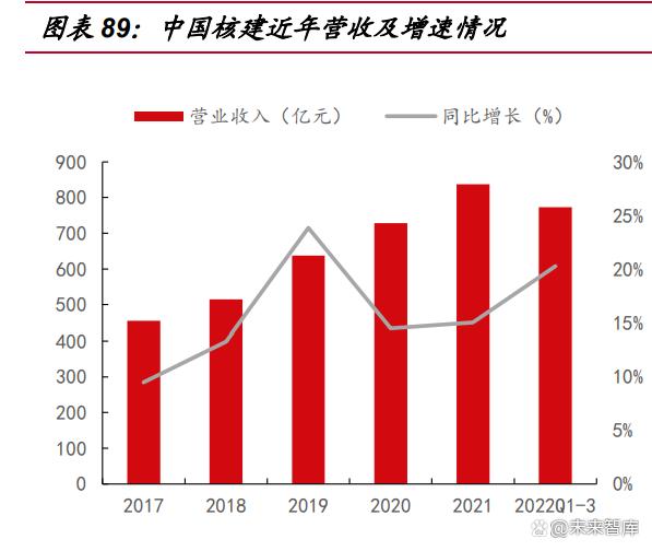 中國核建成立于 2010 年,于 2016 年上市,主營業務為核電工程、工業和民用 工程建設,2018 年中核建設集團與中核集團實行戰略重組推動企業改革。公司正高 水平推進 “國際熱核聚變實驗堆”項目建設,已成功實現主機安裝第一階段任務,國際 品牌影響力顯著提升。公司 2022 年非公開發行募集資金約 25 億元投入建筑工程項 目,拓寬民用工程業務布局。 2022 年公司收入穩健增長,2022 年前三季度公司實現營業收入 772.8 億元,同 比上升 20.3%,歸母凈利潤 12.8 億元,同比上升 22.8%。根據公司經營情況簡報, 2022 年全年營業收入 981.4 億元,同比上升 17.2%,據此計算,2022 年第四季度營 業收入 208.6 億元,同比上升 7.2%。訂單方面,公司 2022 年前三季度累計新增訂 單 995.2 億元,同比提升 2%,根據 2022 年 12 月發布的公開投資者調研情況公告披 露,2022 年全國共核準 10 臺核電機組,8 臺已完成招投標,公司全部參與且全部中 標,剩余 2 臺仍在投標前期階段,公司有望憑借高資質、豐富的建造經驗,持續中標 核島工程訂單。