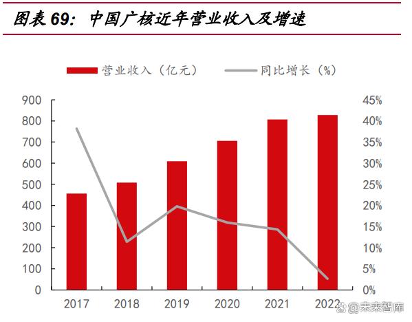 中國廣核是中國廣核集團的核電運營上市主體,主營業務為建設、運營及管理核 電站,銷售核電站所發電力,組織開發核電站的設計及科研工作。截至 2022 年,公 司管理 26 臺在運和 7 臺在建核電機組,裝機容量分別為 29.38GW 和 8.36GW,在 運核電機組容量占全國在運總裝機容量的 51.91%,是我國最大的純核電運營商。 2022 年公司發電量同比下降,主要原因為檢修時間較 2021 年同期增長,臺山1、2 號機組換料大修拖累公司 2022 年的電量表現,公司整體 2022 年發電量下滑 1.38%(包括聯營企業),但公司全年營收及凈利潤等業績表現依然實現了小幅增長。 公司 2022 年營業收入 828.2 億元,同比增長 2.7%,歸母凈利潤 99.6 億元,同比增 長 2.1%。