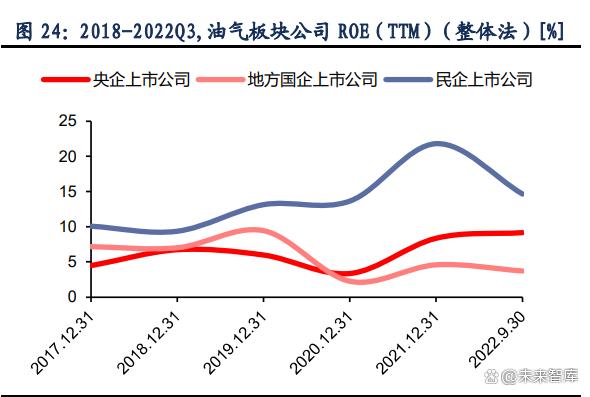 油氣板塊 ROE 數據方面,與煤炭,電力板塊不同,油氣民企上市公司總體高于央企和地方 國企,我們認為,這主要是由于以“三桶油”為代表的央國企的煉油主業毛利率較低,主要 服務于國家戰略;而民企公司主業以大煉化為主,經營效率更高,成本更低。根據 2022 年 三季報,SW 油氣煉化工程板塊,ROE(整體法)為 1.19%;而 SW 煉油化工板塊,ROE (整體法)則為 9.82%。在 PB 估值方面,央企公司顯著低于地方國企和民企,甚至部分處 于破凈狀態,在未來估值重塑方面或有更大空間。
