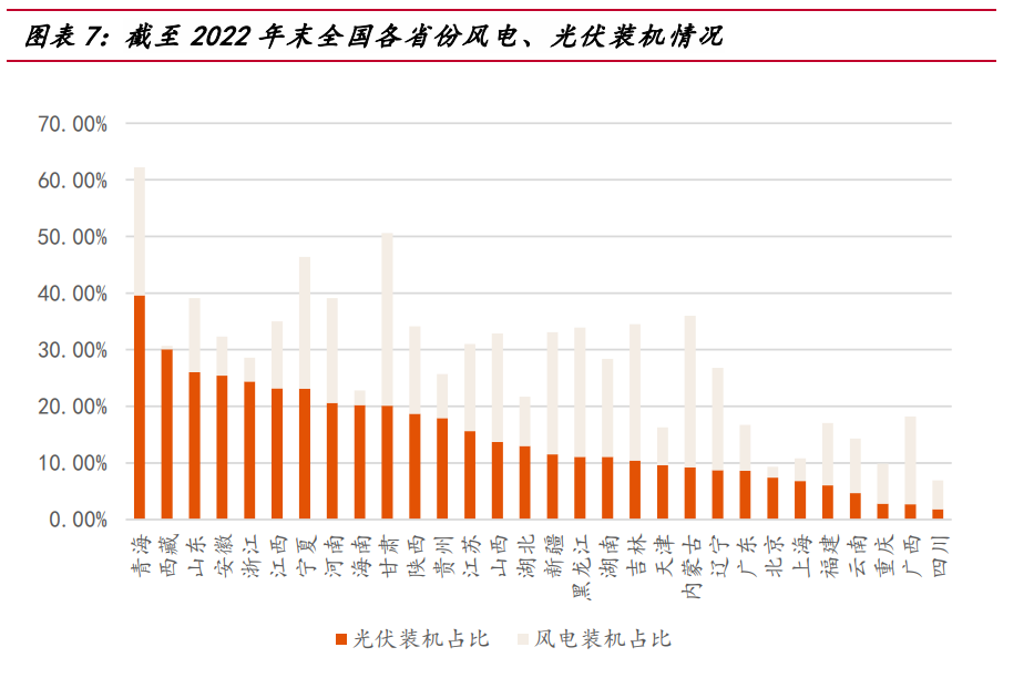 截至 2022 年末,全國各省風電、光伏裝機量占各省總裝機量比例前五名的為青 海、西藏、河北、寧夏、安徽(按光伏裝機排序);全國各省風電、光伏發電量占各 省總發電量比例前五名的為青海、西藏、寧夏、甘肅、山東。 考慮到新能源滲透率與分時電價特征高度相關,因此全國多個省份均可出現類似 山東省的電價分時特征,如青海、寧夏、甘肅等。